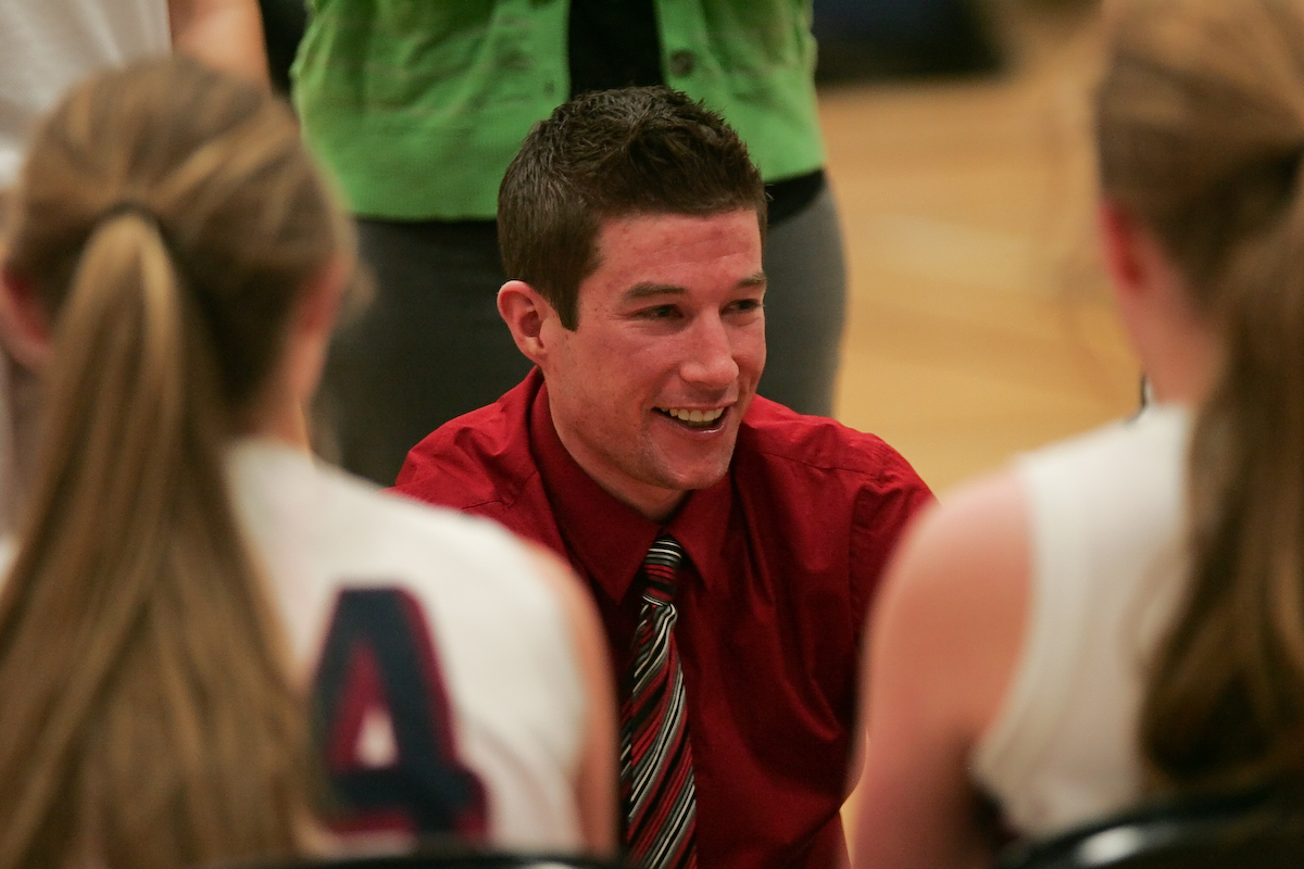 (Thursday February 13th 2014 – Berkley High School – Athletic Gym – Berkley, MI) Berkley HIgh’s coach Jordan Gruppen talks to his team during a timeout Thursday during the game against Ferndale HIgh. Photo by: Brian B. Sevald