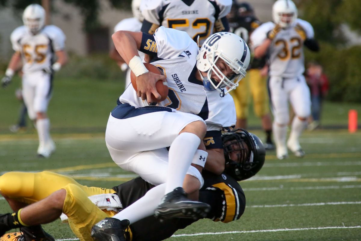 (Friday September 19th 2014 – Bishop Foley Catholic High School – Madison Heights, MI – Athletic Field) Shrine Catholic’s #10 Tim Niehaus intercepts the ball and is tackled during Fiday’s game at Bishop Foley. Photo by: Brian B. Sevald